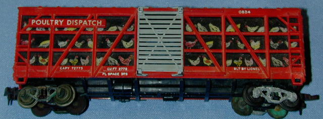Lionel HO 0834 Operating Poultry Car in Very Good Condition with one repaired step and wheel/truck oxidation. Price: $25