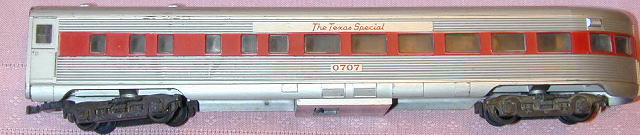 Lionel HO 0707 Texas Special Observation Car in Excellent Condition with Scuffs. The version is with the battery box and black trucks. Price: $25