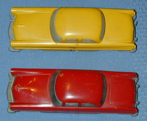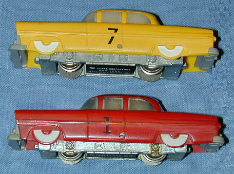 Lionel HO 0068-1 and 0068-7 Race car set from set no. 6100. Caras are in excellent- condition with scratches as shown on red car and yellow car could use good cleaning.